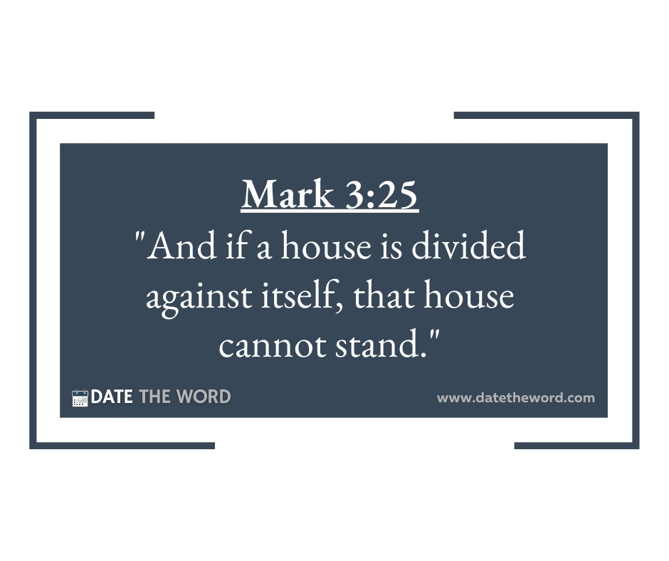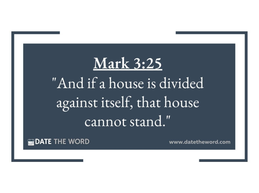 Mark 3:25 “And if a house is divided against itself, that house cannot stand.” Some of the statements from Jesus are blunt and to the point and as well they are very memorable. Mark 3:25 is one of those statements. “IF A HOUSE IS DIVIDED AGAINST ITSELF, THAT HOUSE CANNOT STAND.” While there is power in division such as seen in Exodus 18 where Jethro advises Moses to DIVIDE and Minister by having the Israelites broken up into small groups with group leaders, division can be extremely dangerous and destructive. Whether it is a team or an organization or a home or