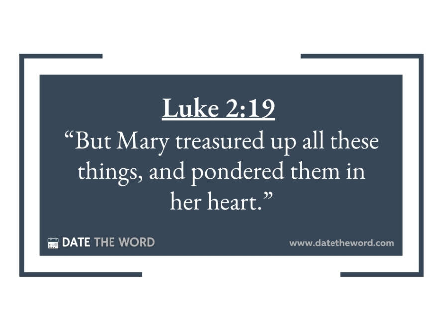 Luke 2:19 “But Mary treasured up all these things, and pondered them in her heart.” Think about how much the life of Mary, the mother of Jesus, changed in 9 short months. One day she is doing her daily routine in Nazareth, thinking about becoming a wife to a great guy named Joseph. Next thing you know there is the angel Gabriel appearing to her and announcing she is going to have a baby boy, but it will not be any ordinary child. Matter of fact, she is told, “And behold, you will conceive in your womb and bring forth