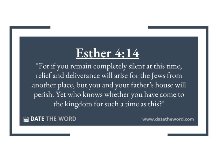 Esther 4:14 “For if you remain completely silent at this time, relief and deliverance will arise for the Jews from another place, but you and your father’s house will perish. Yet who knows whether you have come to the kingdom for such a time as this?” Our verse tells of a pivotal moment in the story and in the life of Esther. Her uncle, Mordecai, has called on Esther to use her influence with the King to put a stop to the evil plan of Haman to annihilate the Jews. You find this appeal in Esther 4:6-8. Esther, however, is hesitant as she knows