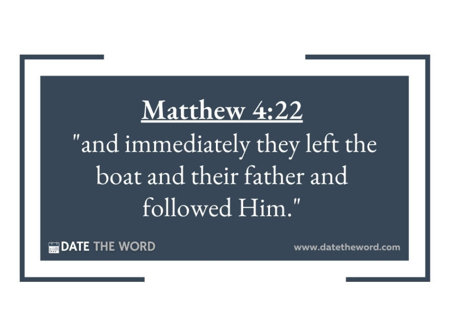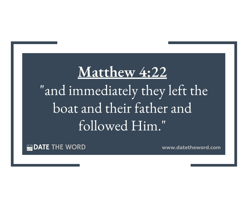 Matthew 4:21-22 Going on from there, He saw two other brothers, James the son of Zebedee, and John his brother, in the boat with Zebedee their father, mending their nets. He called them, 22 and immediately they left the boat and their father, and followed Him.