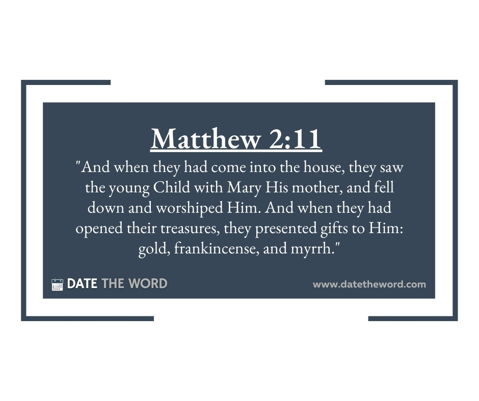 Matthew 2:11 “And when they (the wise men) had come into the house, they saw the young Child with Mary, His mother and fell down and worshiped Him. And when they had opened their treasures, they presented gifts to Him: gold, frankincense, and myrrh.”