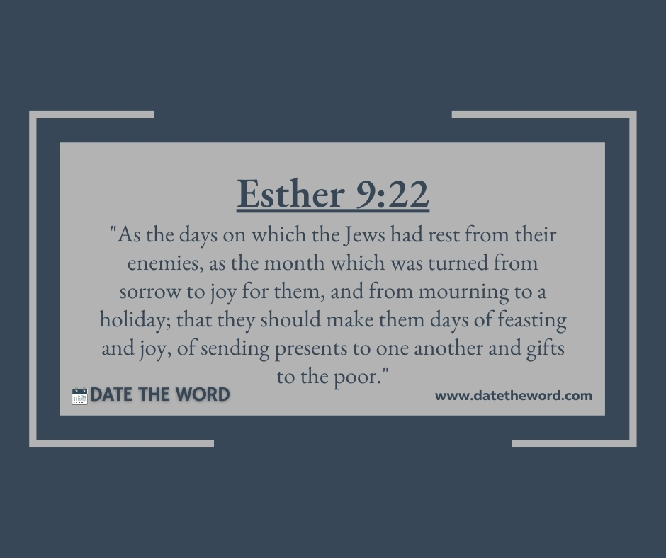 Esther 9:22 “As the days on which the Jews had rest from their enemies, as the month which was turned from sorrow to joy for them, and from mourning to a holiday; that they should make them days of feasting and joy, of sending presents to one another and gifts to the poor.”