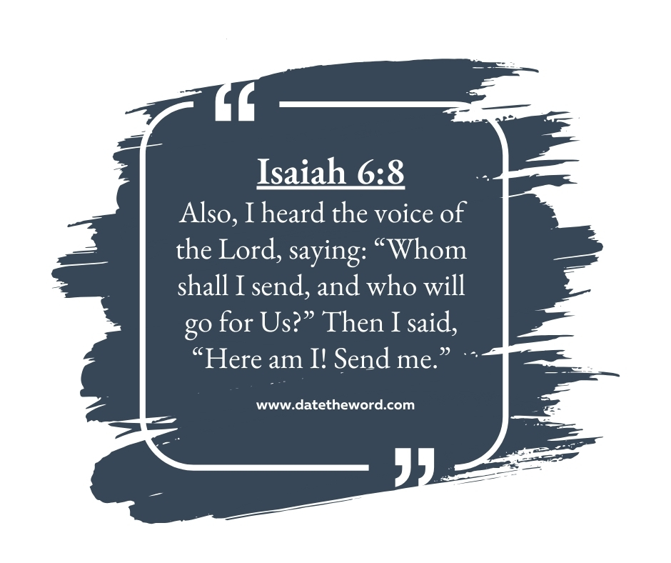 Isaiah 6:8 “Also I heard the voice of the Lord, saying: “Whom shall I send, and who will go for Us?” Then I said, “Here am I! Send me.””