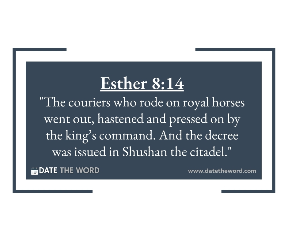Esther 8:14 “The couriers who rode on royal horses went out, hastened and pressed on by the king’s command. And the decree was issued in Shushan the citadel.”