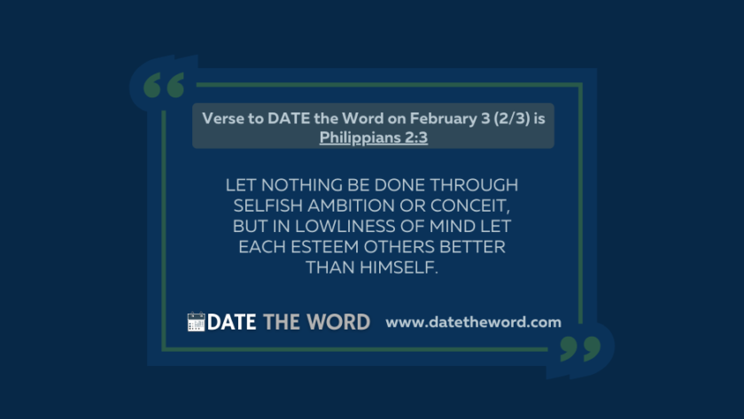 Our verse to DATE the Word on February 3 (2/3) is Philippians 2:3Philippians 2:3 says "Let nothing be done through selfish ambition or conceit, but in lowliness of mind let each esteem others better…