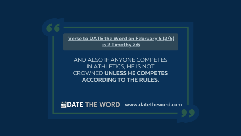 Our verse to DATE the Word on February 5 (2/5) is 2 Timothy 2:52 Timothy 2:5 says, "And also if anyone competes in athletics, he is not crowned unless he competes according…