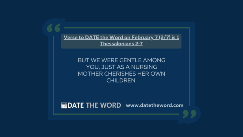 Our verse to DATE the Word on February 7 (2/7) is 1 Thessalonians 2:71 Thessalonians 2:7 says, "But we were gentle among you, just as a nursing mother cherishes her…