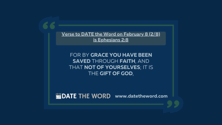 Our verse to DATE the Word on February 8 (2/8) is Ephesians 2:8Ephesians 2:8 says, "For by grace you have been saved through faith, and that not of yourselves; it is the gift of God,"