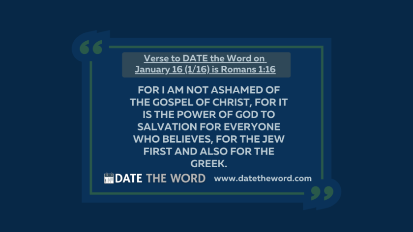 Our verse to DATE the Word on January 16 (1/16) is Romans 1:16Romans 1:16 says, "For I am not ashamed of the gospel of Christ, for it is the power of God to salvation for everyone who believes, for the…