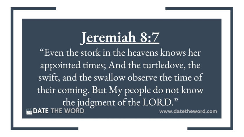 Jeremiah 8:7 “Even the stork in the heavens knows her appointed times; And the turtledove, the swift, and the swallow observe the time of their coming. But My people do…