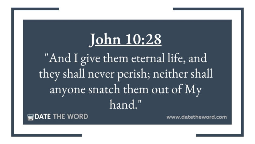 John 10:28 "And I give them eternal life, and they shall never perish; neither shall anyone snatch them out of My hand."