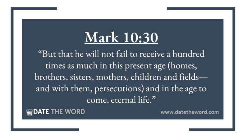 Mark 10:30 “But that he will not fail to receive a hundred times as much in this present age (homes, brothers, sisters, mothers, children and fields—and with them, persecutions) and…