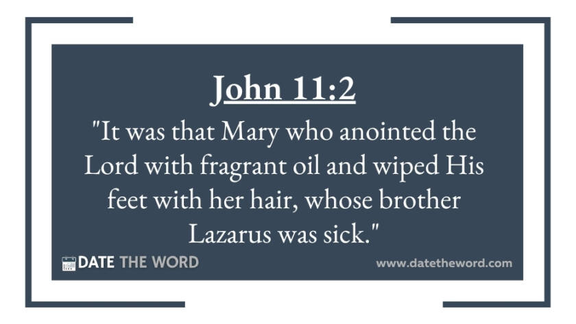 John 11:2 "It was that Mary who anointed the Lord with fragrant oil and wiped His feet with her hair, whose brother Lazarus was sick."