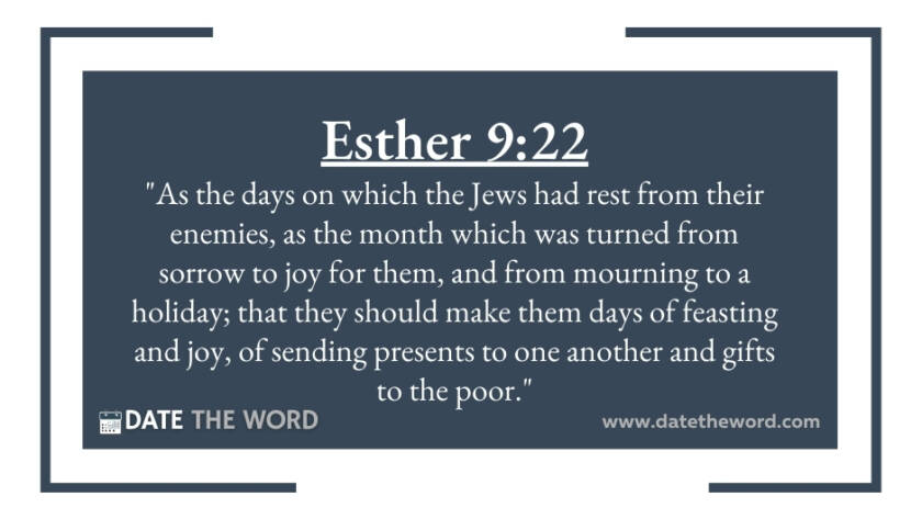 Esther 9:22 "As the days on which the Jews had rest from their enemies, as the month which was turned from sorrow to joy for them, and from mourning to…