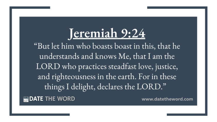 Jeremiah 9:24 “But let him who boasts boast in this, that he understands and knows Me, that I am the LORD who practices steadfast love, justice, and righteousness in the…