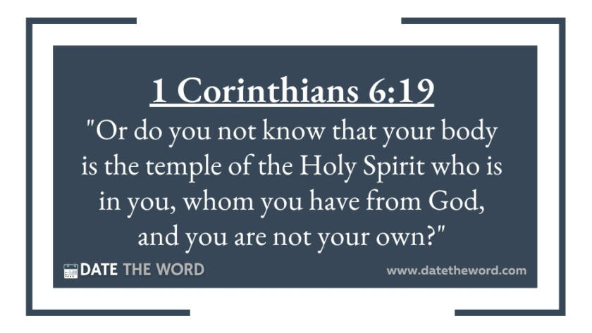 1 Corinthians 6:19 "Or do you not know that your body is the temple of the Holy Spirit who is in you, whom you have from God, and you are…