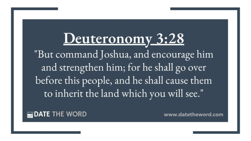 Deuteronomy 3:28 "But command Joshua, and encourage him and strengthen him; for he shall go over before this people, and he shall cause them to inherit the land which you…
