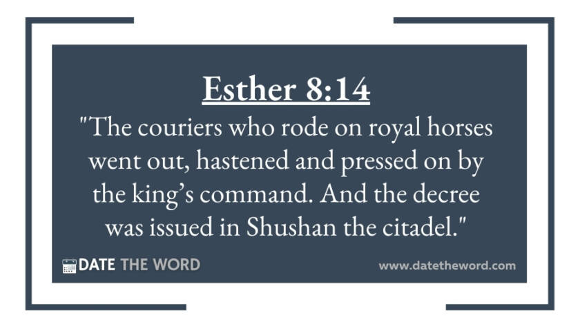 Esther 8:14 "The couriers who rode on royal horses went out, hastened and pressed on by the king’s command. And the decree was issued in Shushan the citadel."