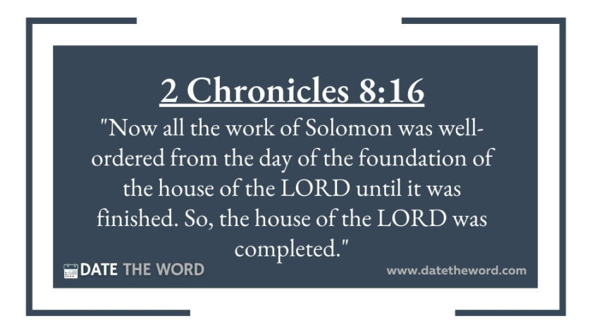 2 Chronicles 8:16 "Now all the work of Solomon was well-ordered from the day of the foundation of the house of the LORD until it was finished. So, the house…
