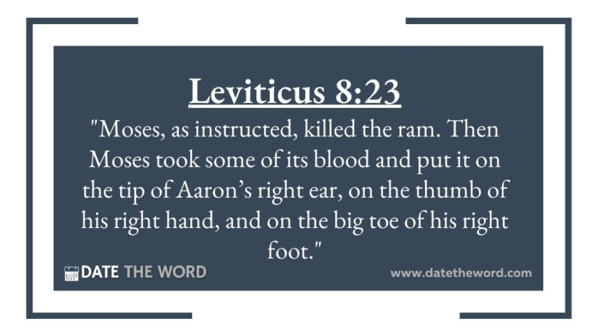 Leviticus 8:23 "Moses, as instructed, killed the ram. Then Moses took some of its blood and put it on the tip of Aaron’s right ear, on the thumb of his…