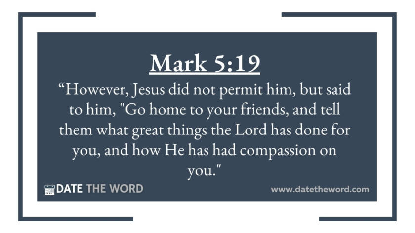 Mark 5:19 “However, Jesus did not permit him, but said to him, "Go home to your friends, and tell them what great things the Lord has done for you, and…
