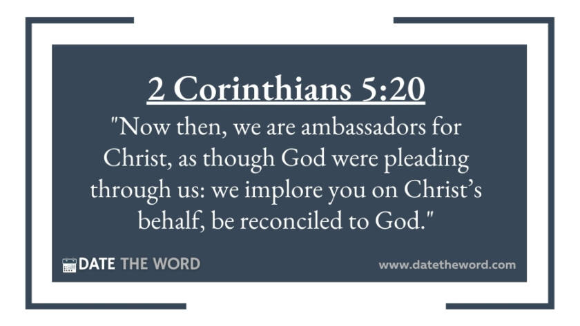 2 Corinthians 5:20 "Now then, we are ambassadors for Christ, as though God were pleading through us: we implore you on Christ’s behalf, be reconciled to God."