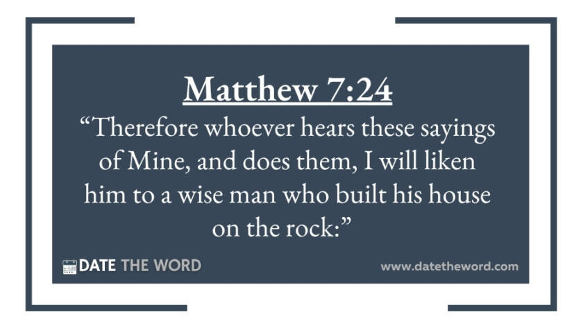 Matthew 7:24 “Therefore whoever hears these sayings of Mine, and does them, I will liken him to a wise man who built his house on the rock:”