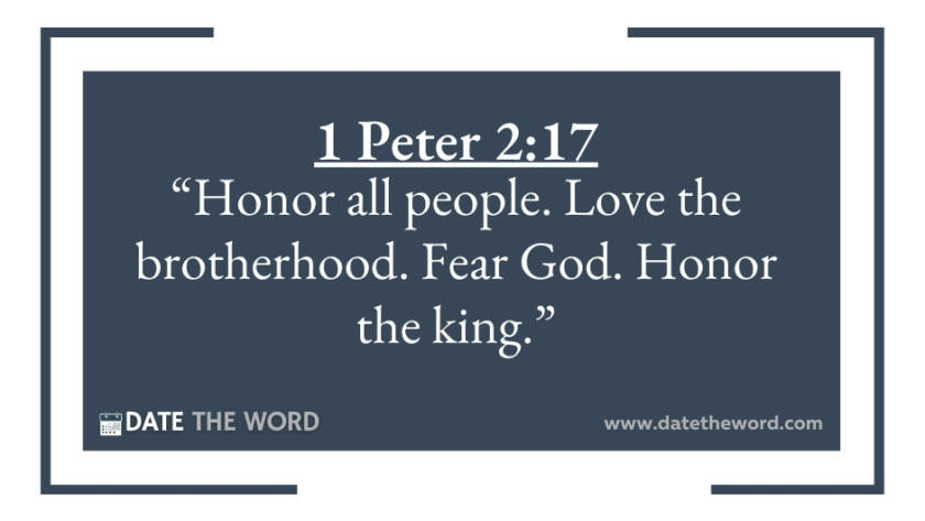 1 Peter 2:17 “Honor all people. Love the brotherhood. Fear God. Honor the king.”