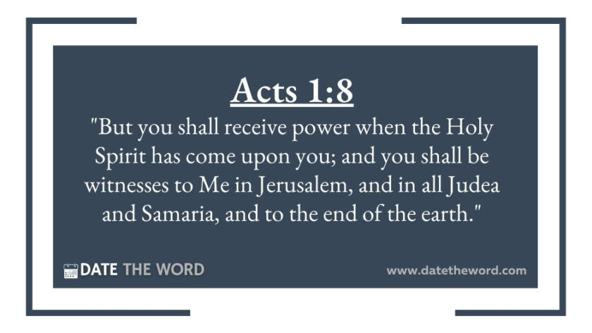 Acts 1:8 "But you shall receive power when the Holy Spirit has come upon you; and you shall be witnesses to Me in Jerusalem, and in all Judea and Samaria,…