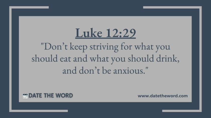 Luke 12:29 "Don’t keep striving for what you should eat and what you should drink, and don’t be anxious."