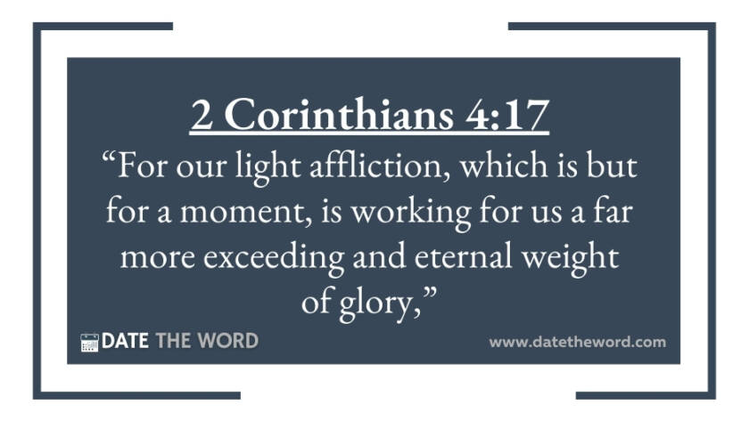 2 Corinthians 4:17 “For our light affliction, which is but for a moment, is working for us a far more exceeding and eternal weight of glory,”