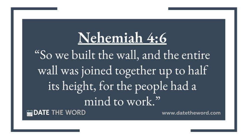 Nehemiah 4:6 “So we built the wall, and the entire wall was joined together up to half its height, for the people had a mind to work.”