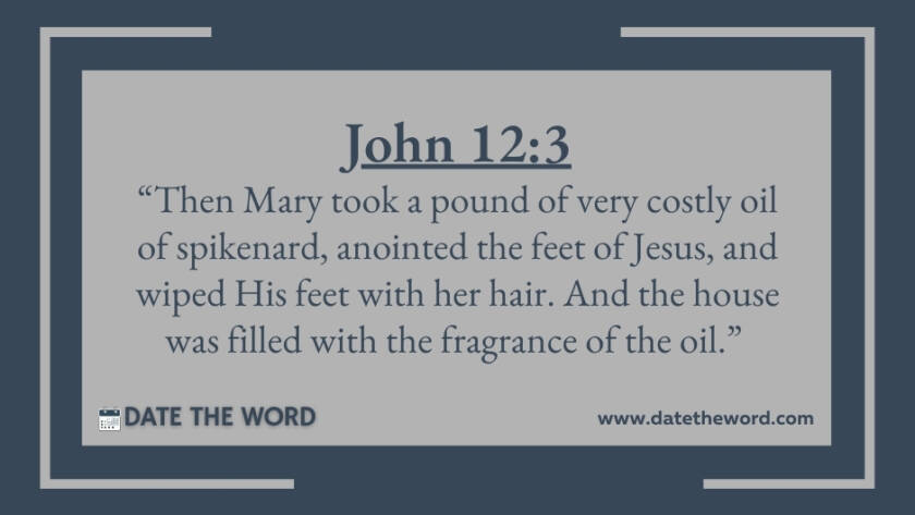 John 12:3 “Then Mary took a pound of very costly oil of spikenard, anointed the feet of Jesus, and wiped His feet with her hair. And the house was filled…