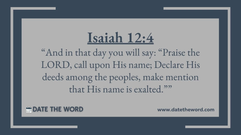 Isaiah 12:4 “And in that day you will say: “Praise the LORD, call upon His name; Declare His deeds among the peoples, make mention that His name is exalted.””