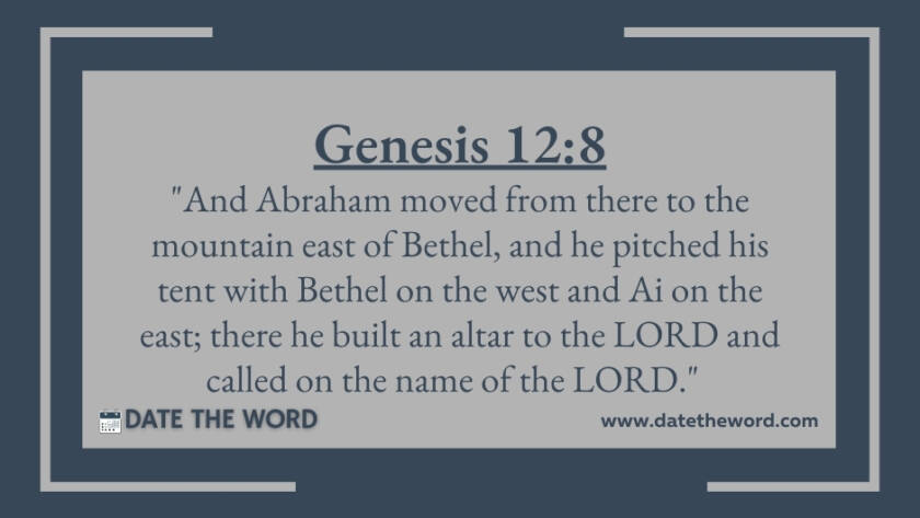 Genesis 12:8 "And Abraham moved from there to the mountain east of Bethel, and he pitched his tent with Bethel on the west and Ai on the east; there he…
