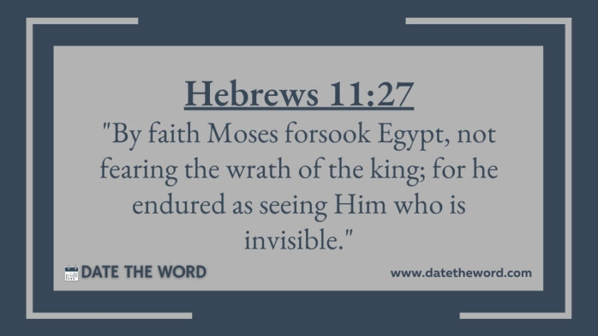 Hebrews 11:27 "By faith Moses forsook Egypt, not fearing the wrath of the king; for he endured as seeing Him who is invisible."