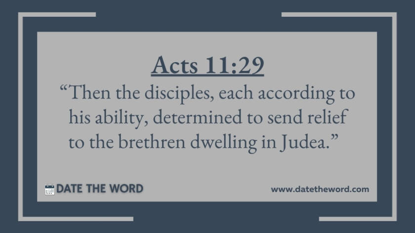 Acts 11:29 “Then the disciples, each according to his ability, determined to send relief to the brethren dwelling in Judea.”