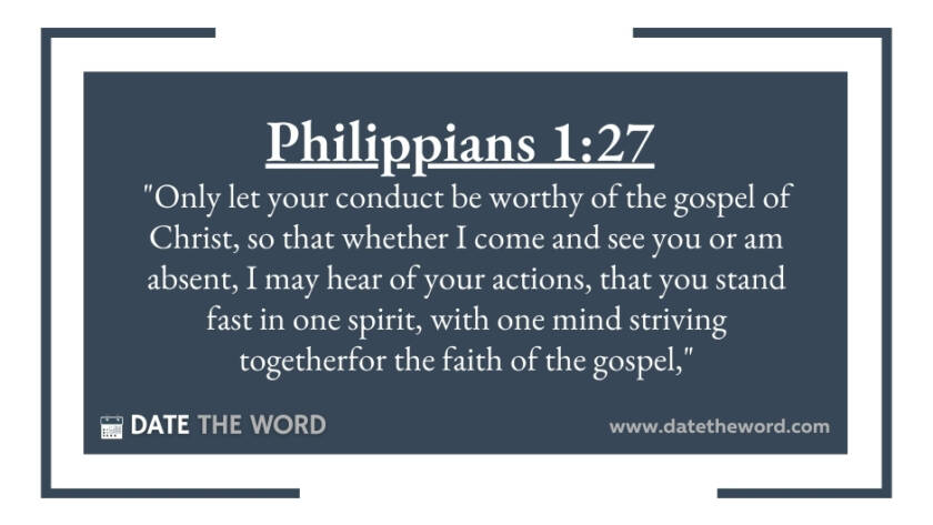 Philippians 1:27 "Only let your conduct be worthy of the gospel of Christ, so that whether I come and see you or am absent, I may hear of your actions, that you stand fast in…