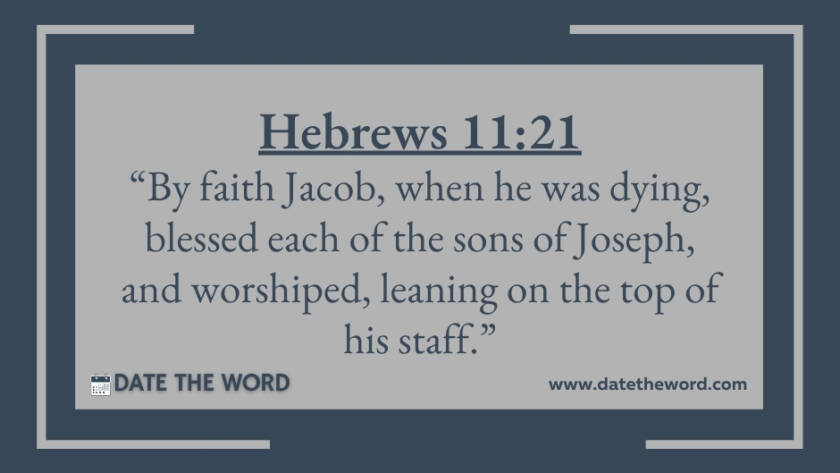 Hebrews 11:21 "By faith Jacob, when he was dying, blessed each of the sons of Joseph, and worshiped, leaning on the top of his staff."