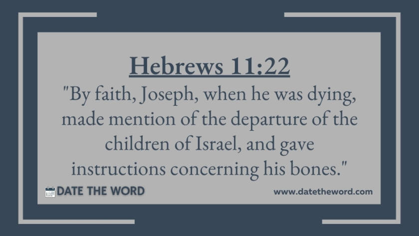 Hebrews 11:22 "By faith, Joseph, when he was dying, made mention of the departure of the children of Israel, and gave instructions concerning his bones."