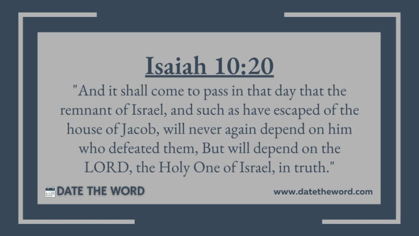 Isaiah 10:20 "And it shall come to pass in that day that the remnant of Israel, and such as have escaped of the house of Jacob, will never again depend…