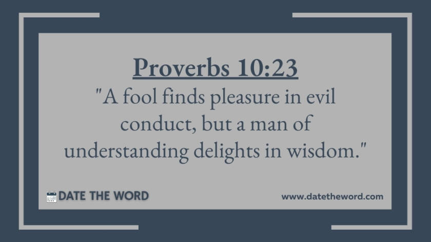 Proverbs 10:23 "A fool finds pleasure in evil conduct, but a man of understanding delights in wisdom."