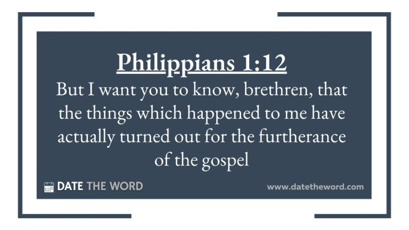 Philippians 1:12 "But I want you to know, brethren, that the things which happened to me have actually turned out for the furtherance of the gospel,"