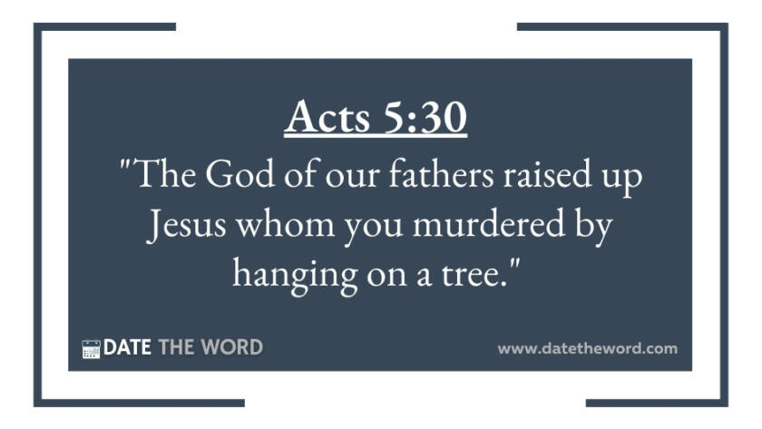 Acts 5:30 "The God of our fathers raised up Jesus whom you murdered by hanging on a tree."