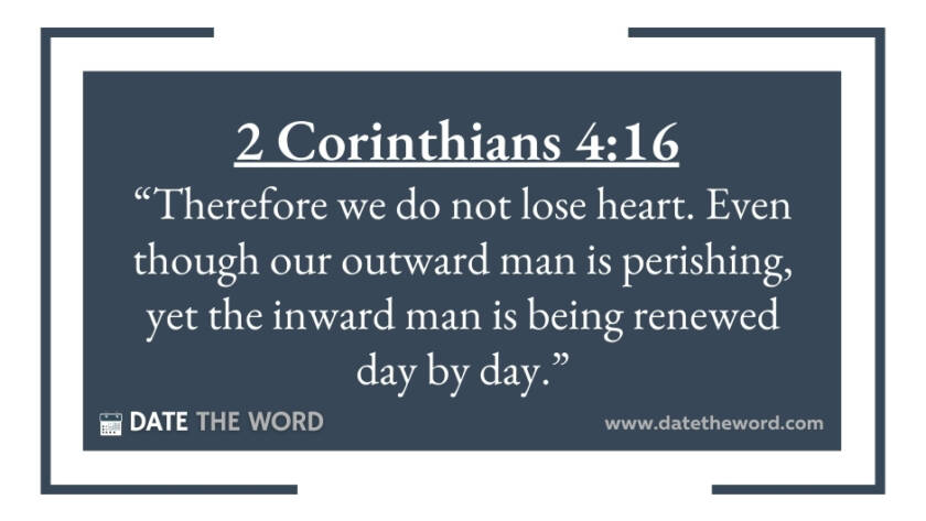 2 Corinthians 4:16 “Therefore we do not lose heart. Even though our outward man is perishing, yet the inward man is being renewed day by day.”