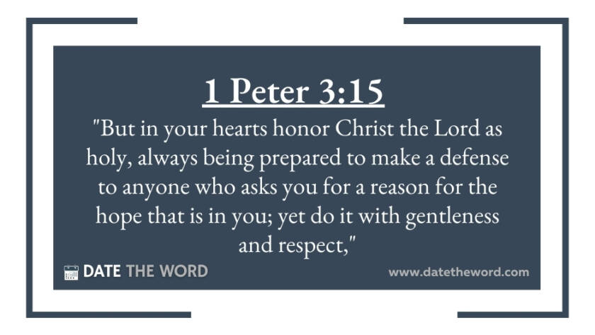 1 Peter 3:15 "But in your hearts honor Christ the Lord as holy, always being prepared to make a defense to anyone who asks you for a reason for the hope…