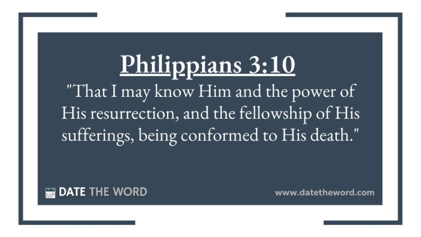 Philippians 3:10 "That I may know Him and the power of His resurrection, and the fellowship of His sufferings, being conformed to His death."