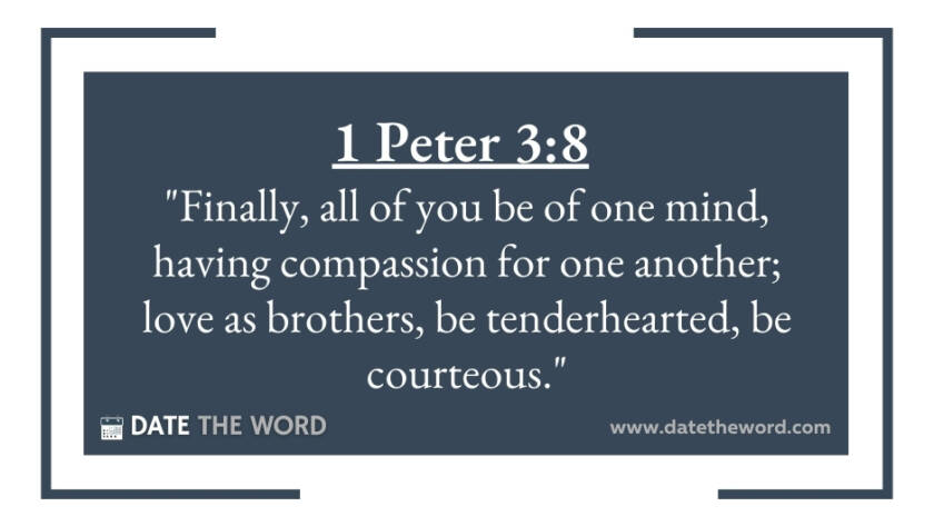 1 Peter 3:8 "Finally, all of you be of one mind, having compassion for one another; love as brothers, be tenderhearted, be courteous."