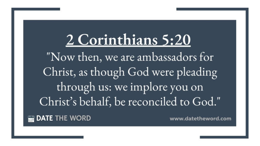 2 Corinthians 5:20 "Now then, we are ambassadors for Christ, as though God were pleading through us: we implore you on Christ’s behalf, be reconciled to God."