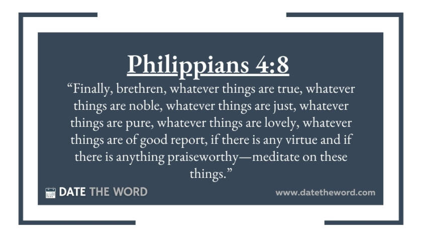 Philippians 4:8 “Finally, brethren, whatever things are true, whatever things are noble, whatever things are just, whatever things are pure, whatever things are lovely, whatever things are of good report,…